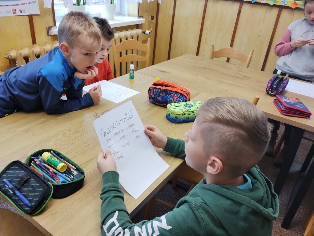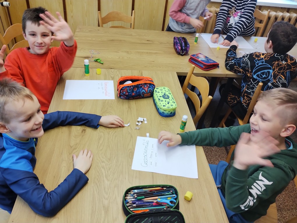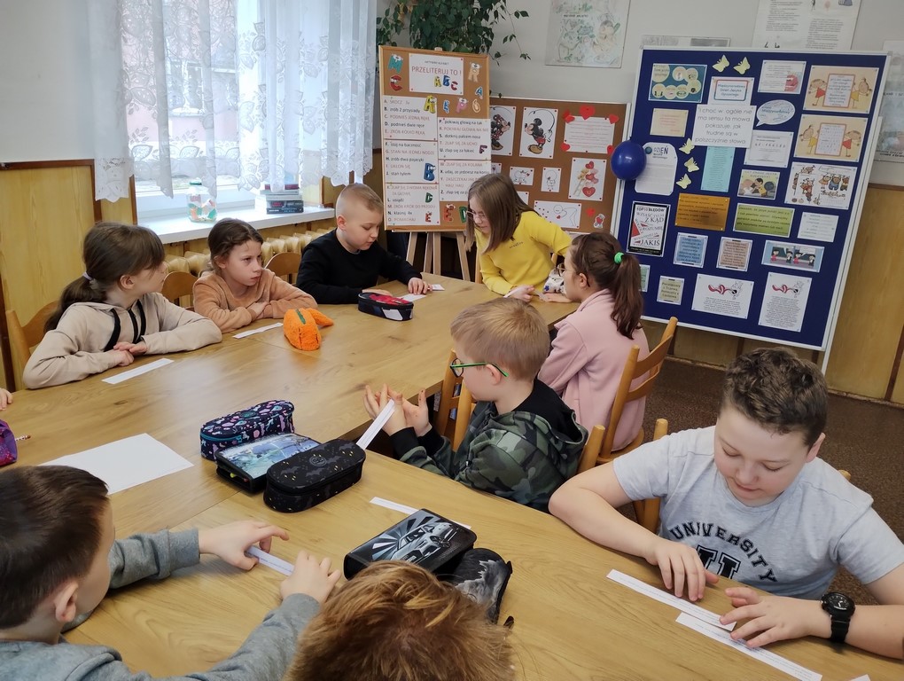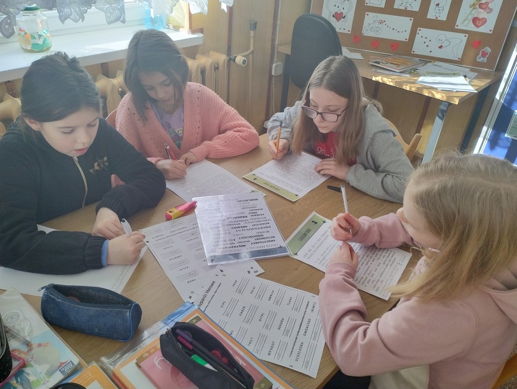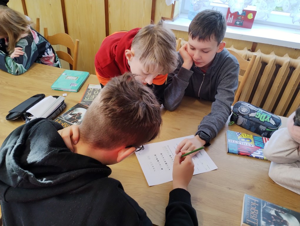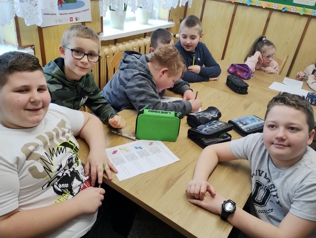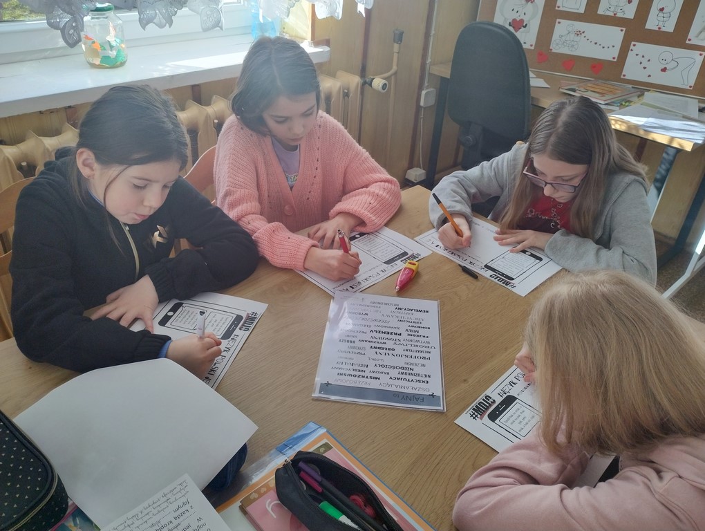 W ramach obchodów Międzynarodowego Dnia Języka Ojczystego biblioteka, jak co roku przygotowała dla uczniów klas I-III gry i zabawy językowe ( takie jak np. duble ortograficzne, rozkodywanie wyrazów, łączenie nazw z odpowiednimi częściami mowy, aktywny alfabet – tworzenie haseł dzięki wykonywaniu określonych czynności, kodowanie – dyktando graficzne, krzesła ortograficzne – zabawy w ortografie i łamńce językowe ). Natomiast piątoklasiści spróbowali swoich sił w zabawach językowych ze słowem Fajny. Uczniowie mieli okazję przekonać się, jak bardzo pojemne jest słowo Fajny. Na koniec każdy uczeń otrzymał tekst, w którym słowo Fajny musiał zamienić na stosowny wyraz bliskoznaczny.