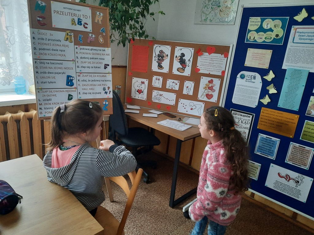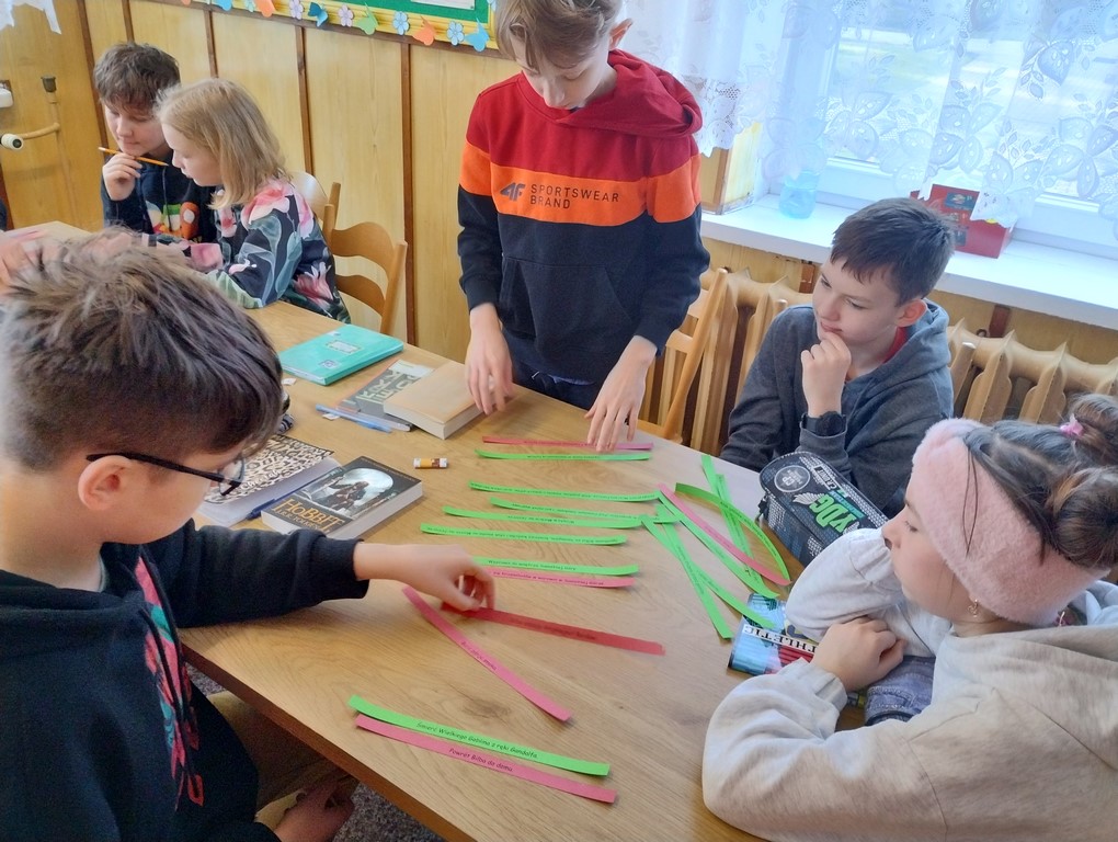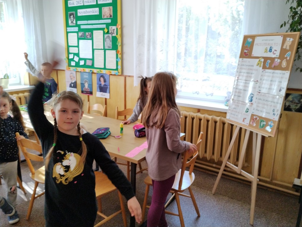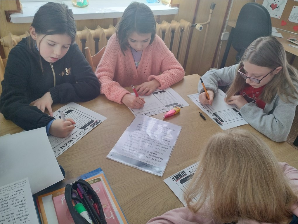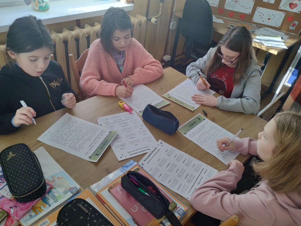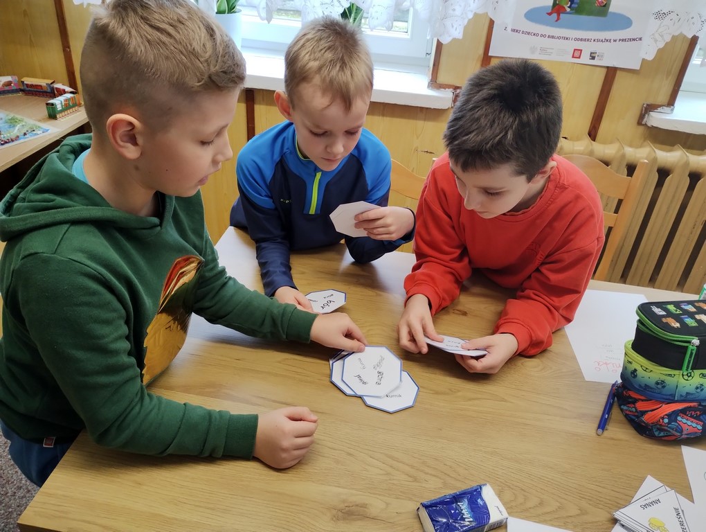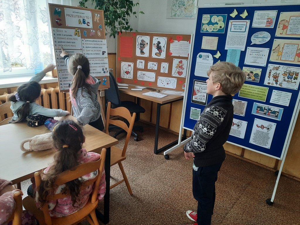 W ramach obchodów Międzynarodowego Dnia Języka Ojczystego biblioteka, jak co roku przygotowała dla uczniów klas I-III gry i zabawy językowe ( takie jak np. duble ortograficzne, rozkodywanie wyrazów, łączenie nazw z odpowiednimi częściami mowy, aktywny alfabet – tworzenie haseł dzięki wykonywaniu określonych czynności, kodowanie – dyktando graficzne, krzesła ortograficzne – zabawy w ortografie i łamńce językowe ). Natomiast piątoklasiści spróbowali swoich sił w zabawach językowych ze słowem Fajny. Uczniowie mieli okazję przekonać się, jak bardzo pojemne jest słowo Fajny. Na koniec każdy uczeń otrzymał tekst, w którym słowo Fajny musiał zamienić na stosowny wyraz bliskoznaczny.
