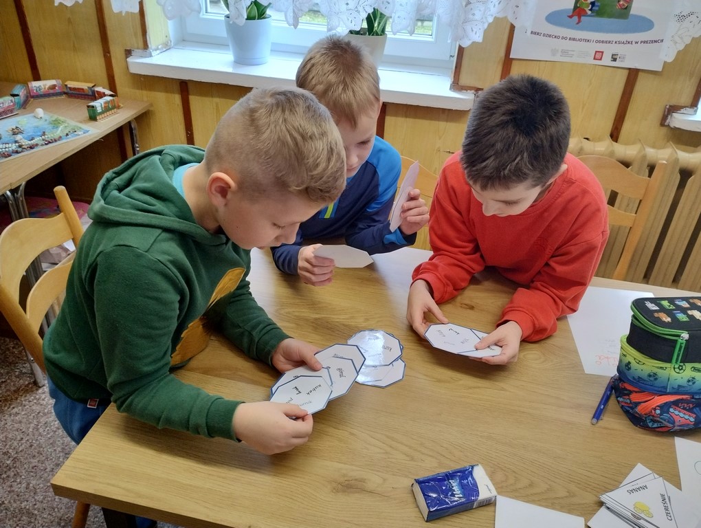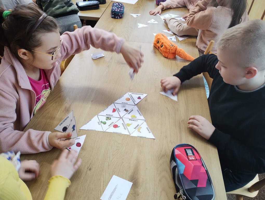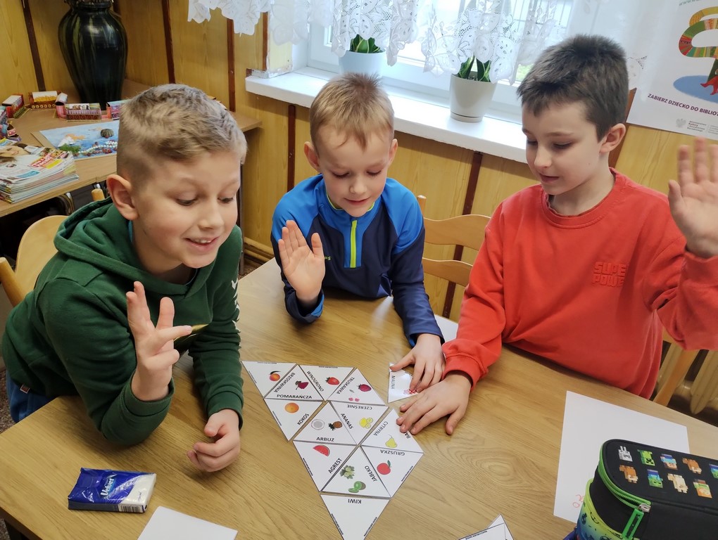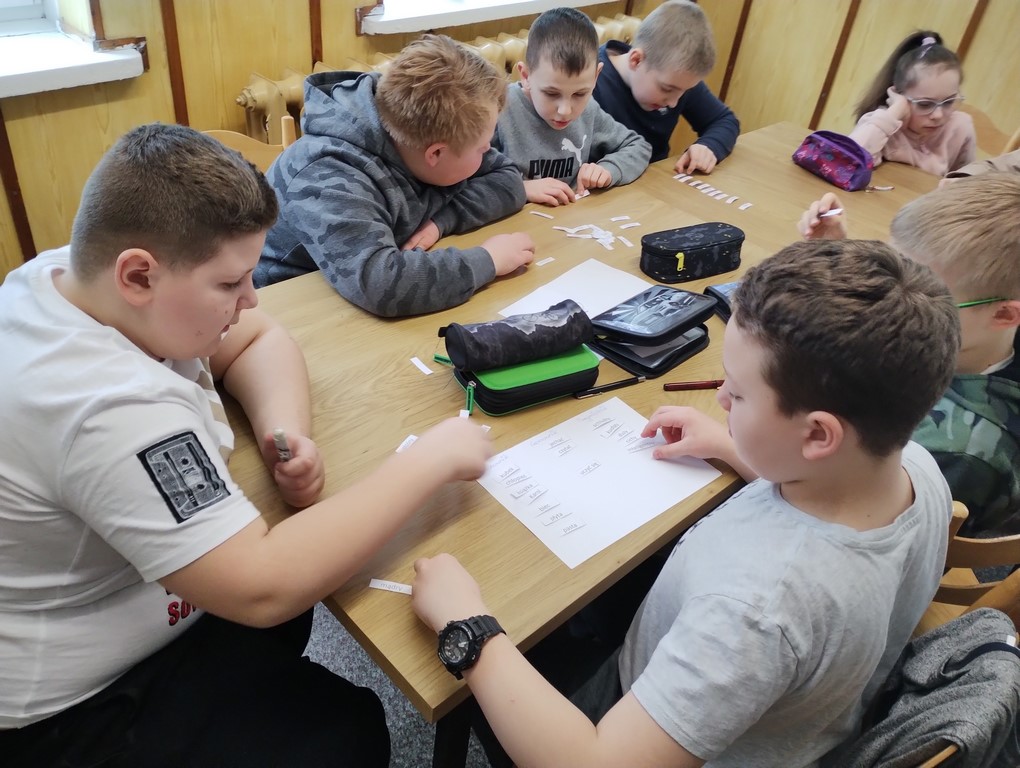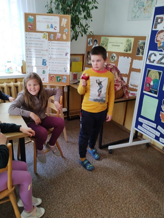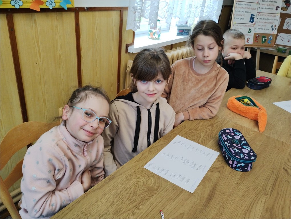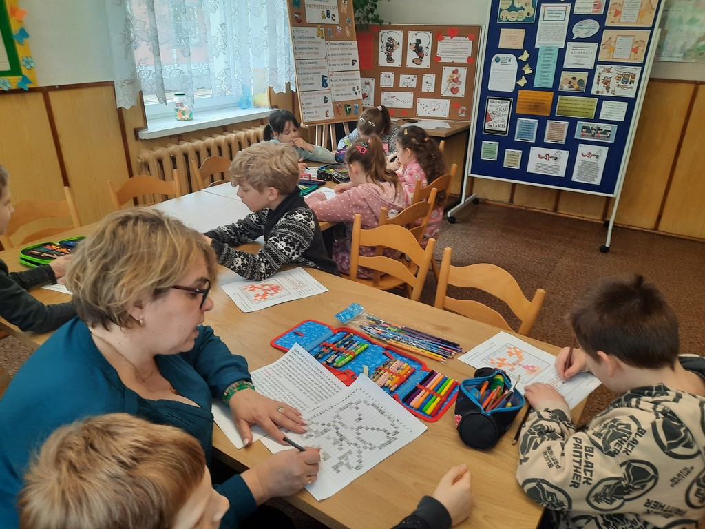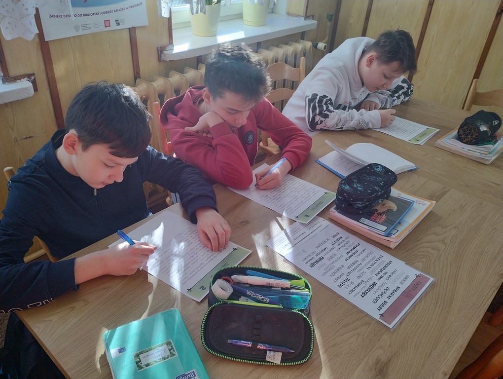 W ramach obchodów Międzynarodowego Dnia Języka Ojczystego biblioteka, jak co roku przygotowała dla uczniów klas I-III gry i zabawy językowe ( takie jak np. duble ortograficzne, rozkodywanie wyrazów, łączenie nazw z odpowiednimi częściami mowy, aktywny alfabet – tworzenie haseł dzięki wykonywaniu określonych czynności, kodowanie – dyktando graficzne, krzesła ortograficzne – zabawy w ortografie i łamńce językowe ). Natomiast piątoklasiści spróbowali swoich sił w zabawach językowych ze słowem Fajny. Uczniowie mieli okazję przekonać się, jak bardzo pojemne jest słowo Fajny. Na koniec każdy uczeń otrzymał tekst, w którym słowo Fajny musiał zamienić na stosowny wyraz bliskoznaczny.