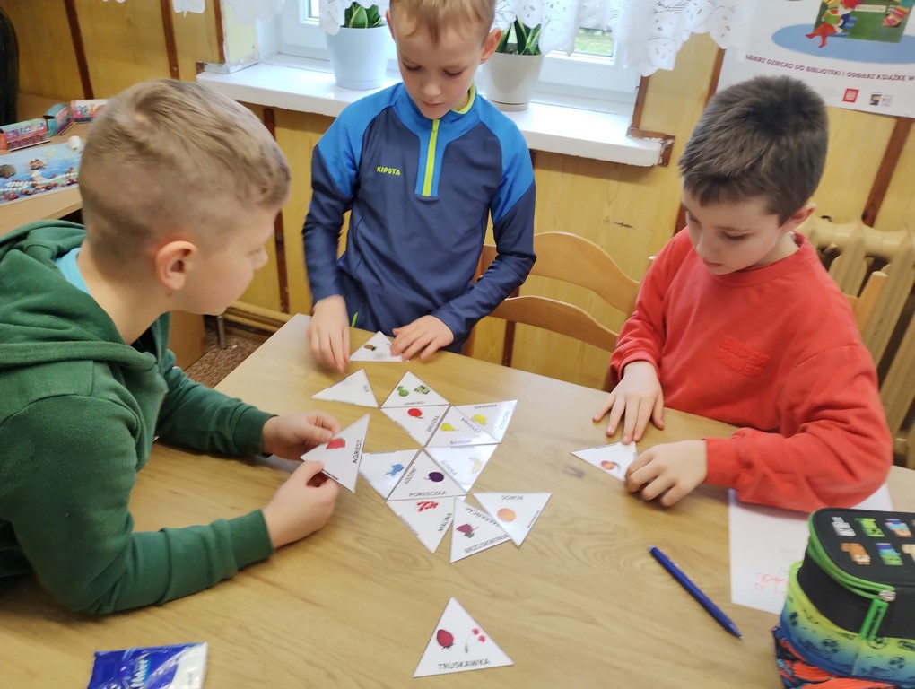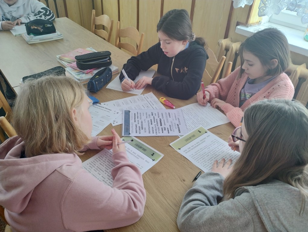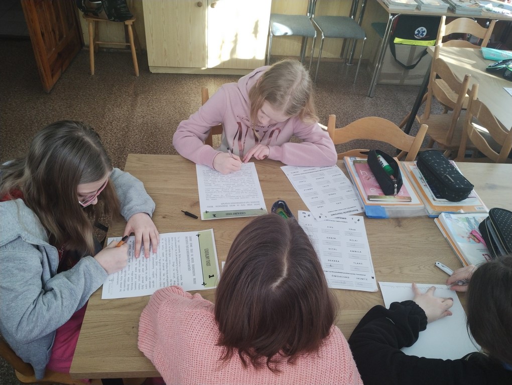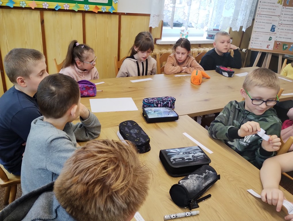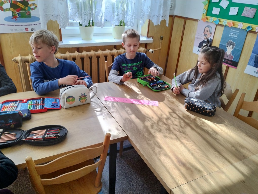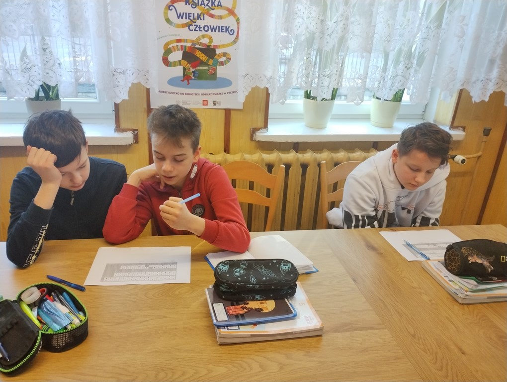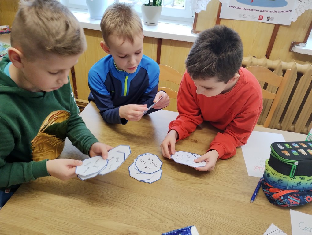 W ramach obchodów Międzynarodowego Dnia Języka Ojczystego biblioteka, jak co roku przygotowała dla uczniów klas I-III gry i zabawy językowe ( takie jak np. duble ortograficzne, rozkodywanie wyrazów, łączenie nazw z odpowiednimi częściami mowy, aktywny alfabet – tworzenie haseł dzięki wykonywaniu określonych czynności, kodowanie – dyktando graficzne, krzesła ortograficzne – zabawy w ortografie i łamńce językowe ). Natomiast piątoklasiści spróbowali swoich sił w zabawach językowych ze słowem Fajny. Uczniowie mieli okazję przekonać się, jak bardzo pojemne jest słowo Fajny. Na koniec każdy uczeń otrzymał tekst, w którym słowo Fajny musiał zamienić na stosowny wyraz bliskoznaczny.
