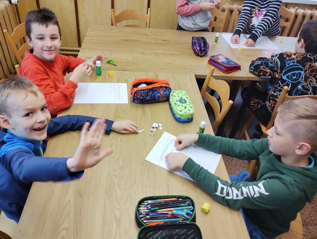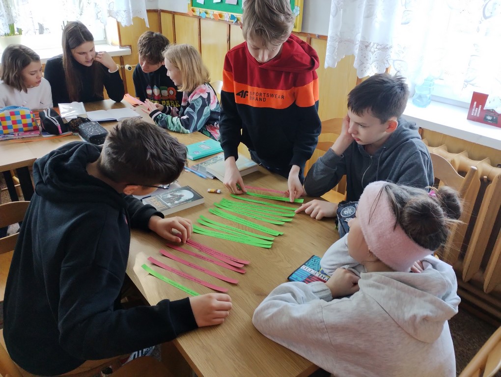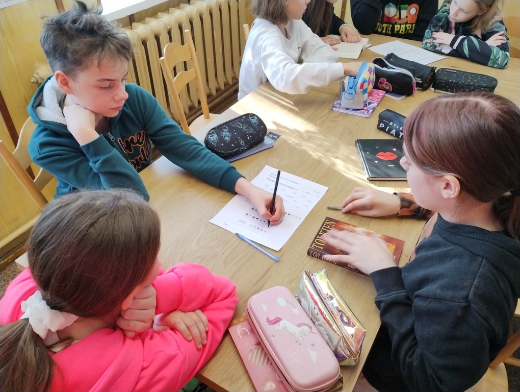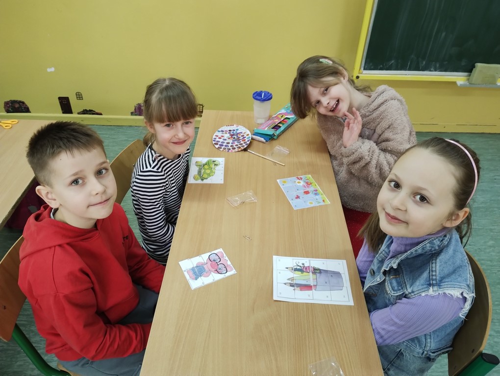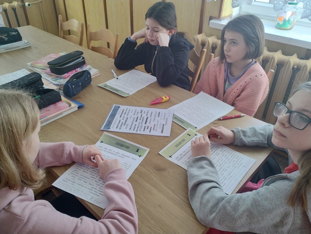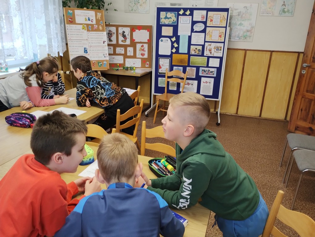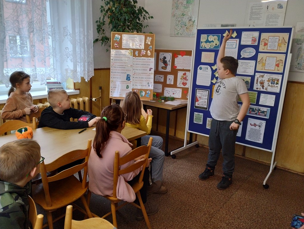 W ramach obchodów Międzynarodowego Dnia Języka Ojczystego biblioteka, jak co roku przygotowała dla uczniów klas I-III gry i zabawy językowe ( takie jak np. duble ortograficzne, rozkodywanie wyrazów, łączenie nazw z odpowiednimi częściami mowy, aktywny alfabet – tworzenie haseł dzięki wykonywaniu określonych czynności, kodowanie – dyktando graficzne, krzesła ortograficzne – zabawy w ortografie i łamńce językowe ). Natomiast piątoklasiści spróbowali swoich sił w zabawach językowych ze słowem Fajny. Uczniowie mieli okazję przekonać się, jak bardzo pojemne jest słowo Fajny. Na koniec każdy uczeń otrzymał tekst, w którym słowo Fajny musiał zamienić na stosowny wyraz bliskoznaczny.