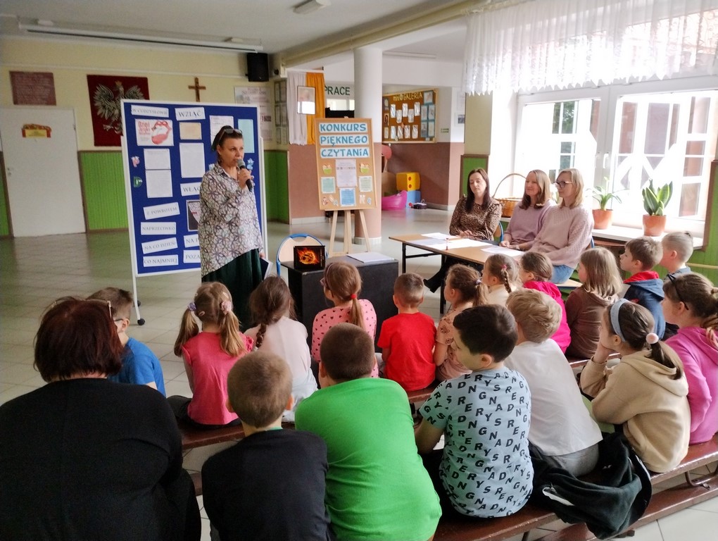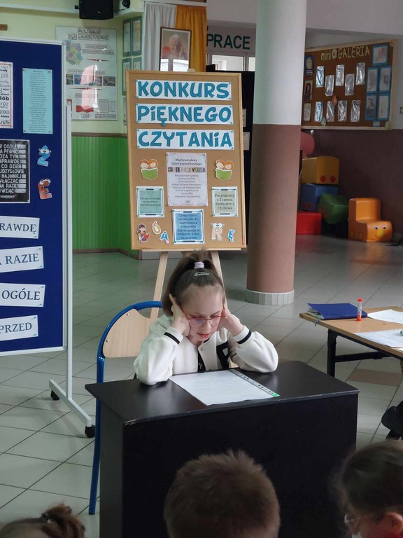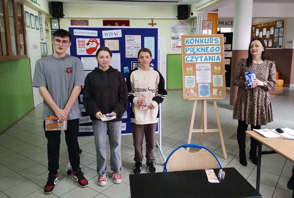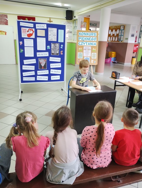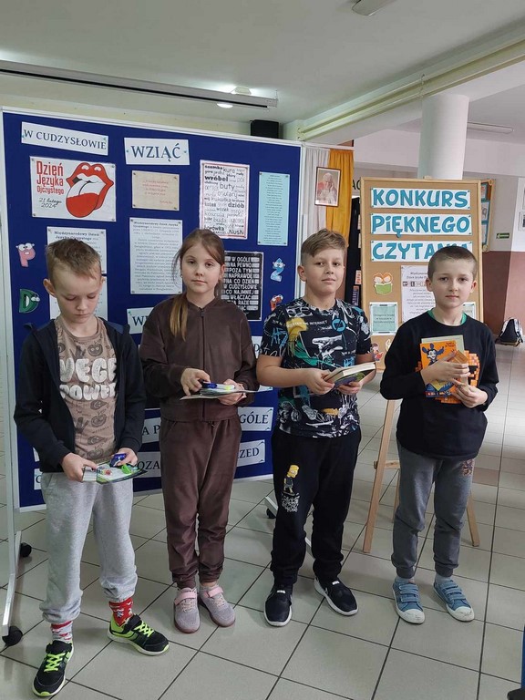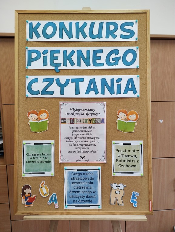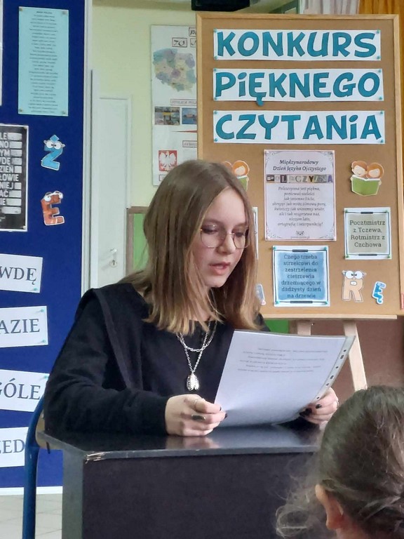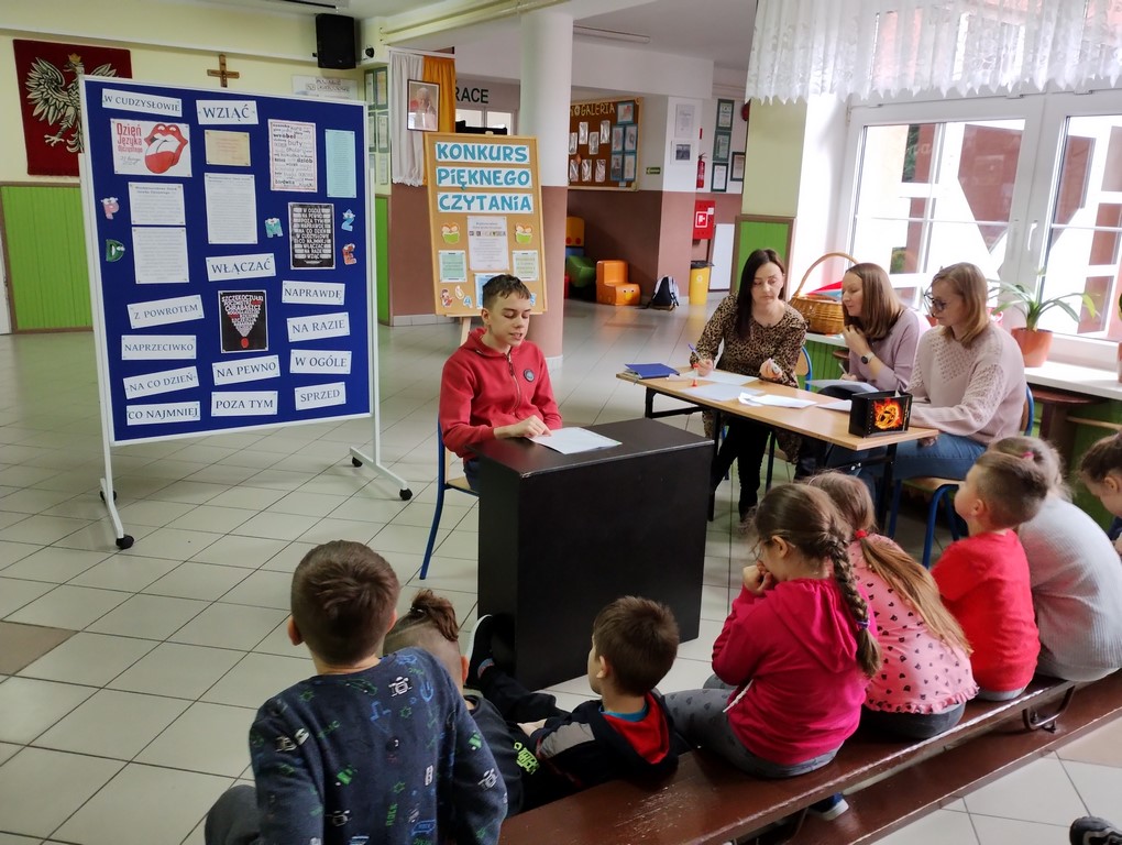 22 lutego w ramach obchodów Międzynarodowego Dnia Języka Ojczystego, biblioteka wspólnie z panią Grażyną Borawską, nauczycielem języka polskiego przygotowała konkurs „Mistrz Pięknego Czytania”. Głównym celem konkursu było przede wszystkim rozbudzenie pasji czytania, kształtowanie umiejętności pięknego czytania oraz popularyzacja książek i czytelnictwa wśród dzieci i młodzieży. Konkurs odbył się w trzech kategoriach wiekowych: klasy I-III, klasy IV-V i klasy VI-VIII. Uczestnicy czytali losowo wybrany fragment książki przygotowany przez organizatorów - adekwatny do wieku uczestników. Z uwagą i przyjemnością wysłuchaliśmy m.in. fragmentów powieści ,,Cukierku, Ty łobuzie!” Waldemara Cichonia, „Nasza mama czarodziejka” Joanny Papuzińskiej, „Rany Julek! O tym, jak Julian Tuwim został poetą” Agnieszki Frączak, ,,Opowieści z Narnii. Lew, czarownica i stara szafa” Clive'a Staplesa Lewisa, ,,Mikołajka” Rene Goscinny'ego i Jeana Jacquesa Sempe, ,,Felix, Net i Nika oraz Gang Niewidzialnych Ludzi” Rafała Kosika, „Igrzyska śmierci” Suzanne Collins i „Pozłacaną rybkę” Barbary Kosmowskiej.