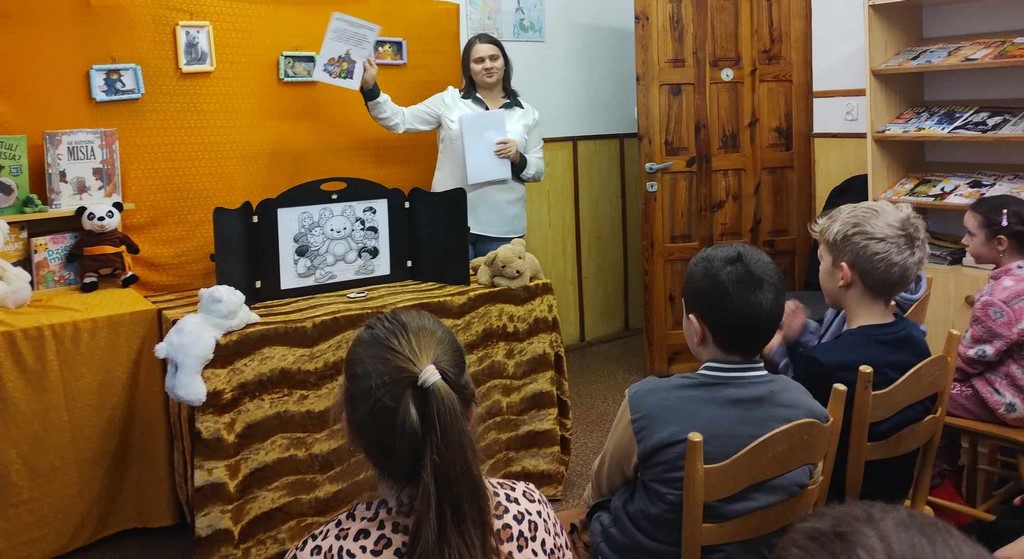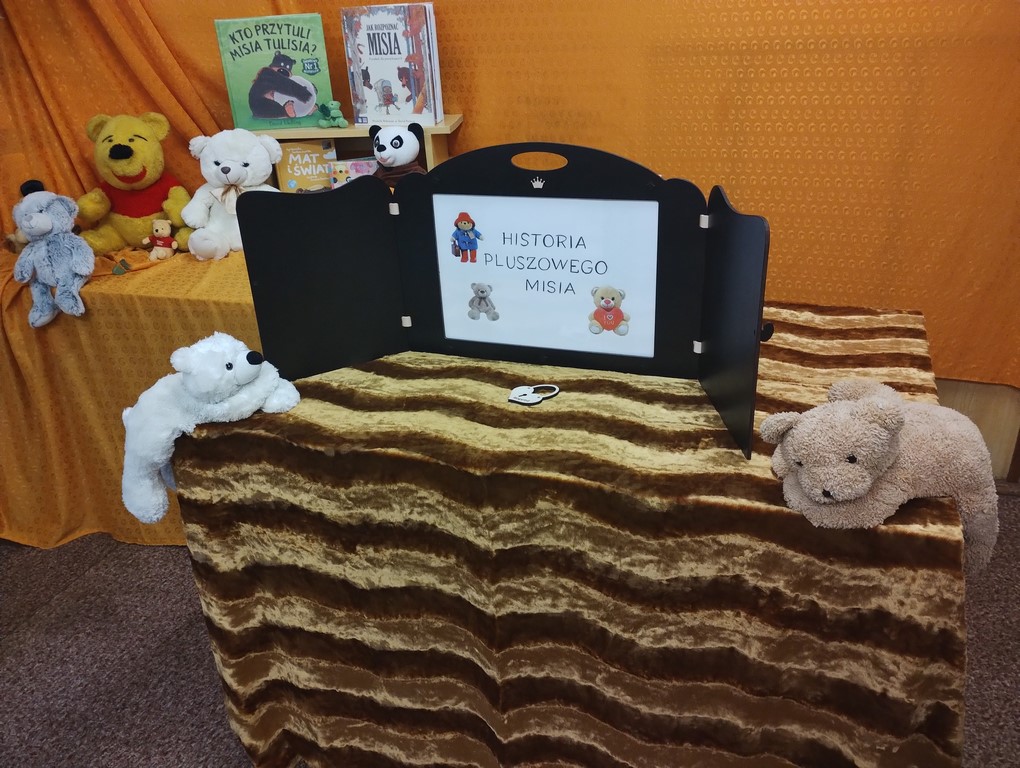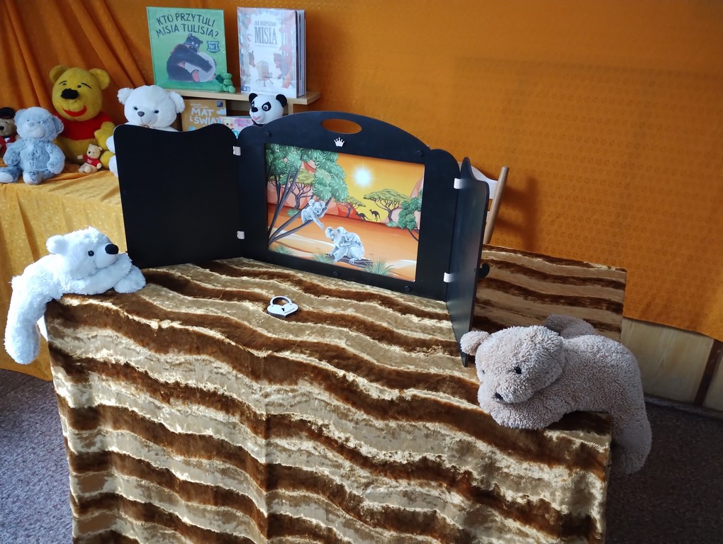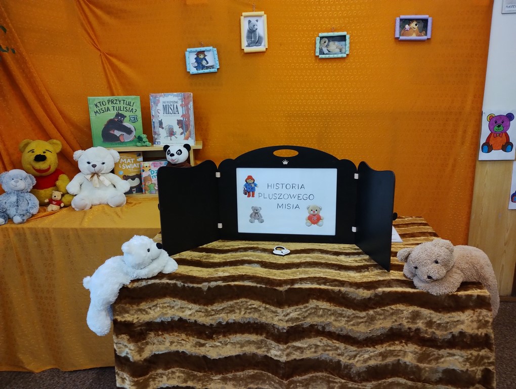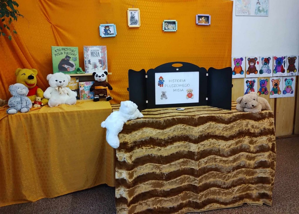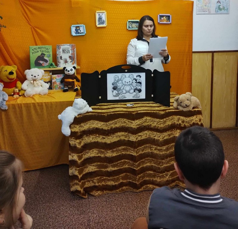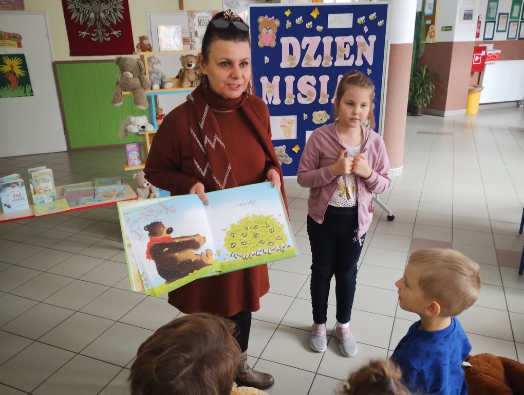 Z tej okazji biblioteka przeprowadziła zajęcia z wykorzystaniem teatrzyku obrazkowego kamisibai dla przedszkolaków i uczniów klas 1-4. Na początku spotkania dzieci poznały historię, która opowiadała o tym, jak pluszowy miś stał się najlepszym przyjacielem dzieci na całym świecie. Następnie z dużym zainteresowaniem wysłuchały opowiadania „Misiowe opowieści – niedźwiedź brunatny.” Dzieci dowiedziały się gdzie mieszkają prawdziwe misie, co lubią jeść i jakie mają zwyczaje oraz o tym, że koala nie jest misiem.