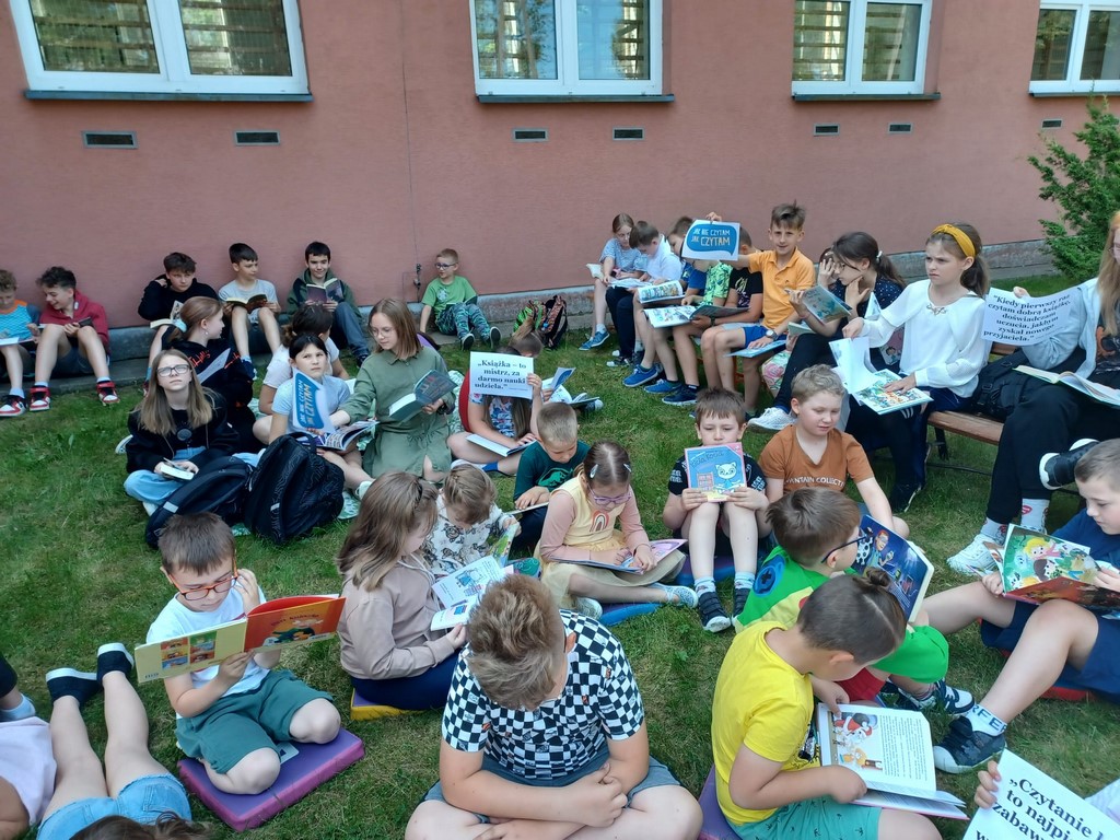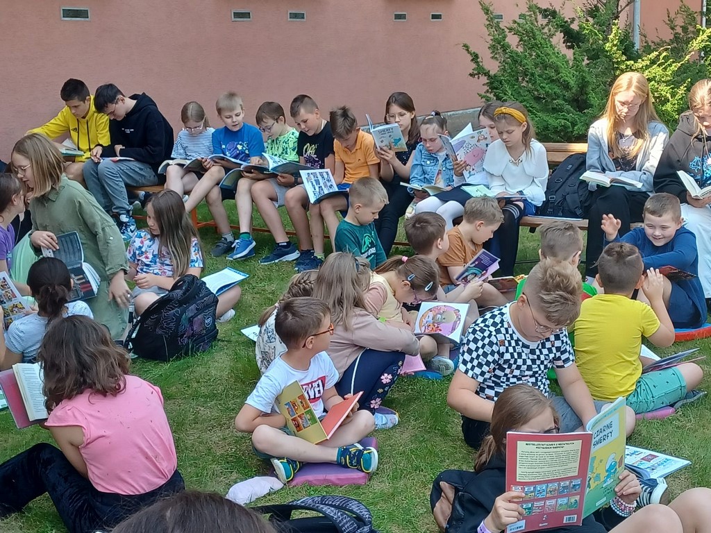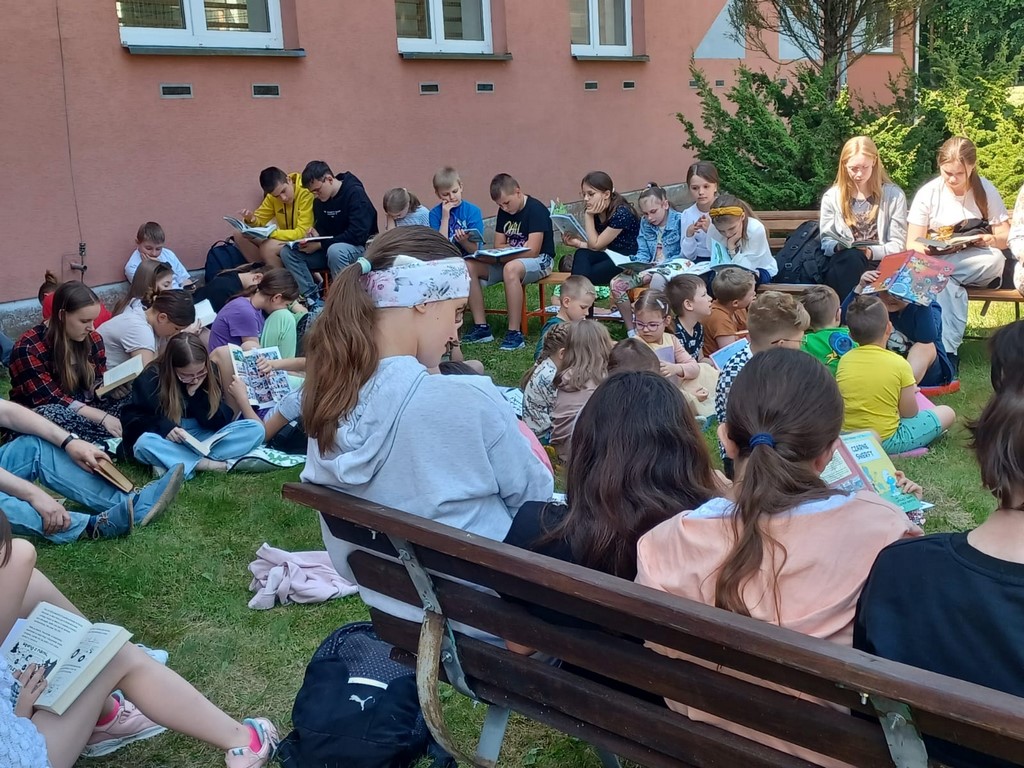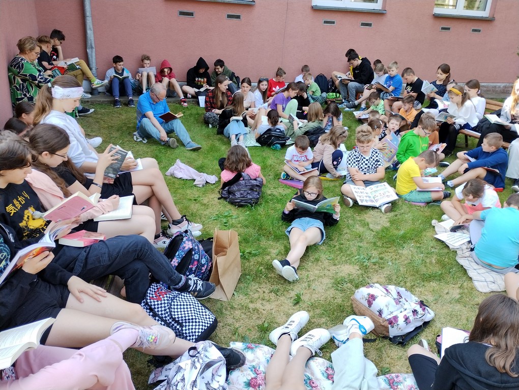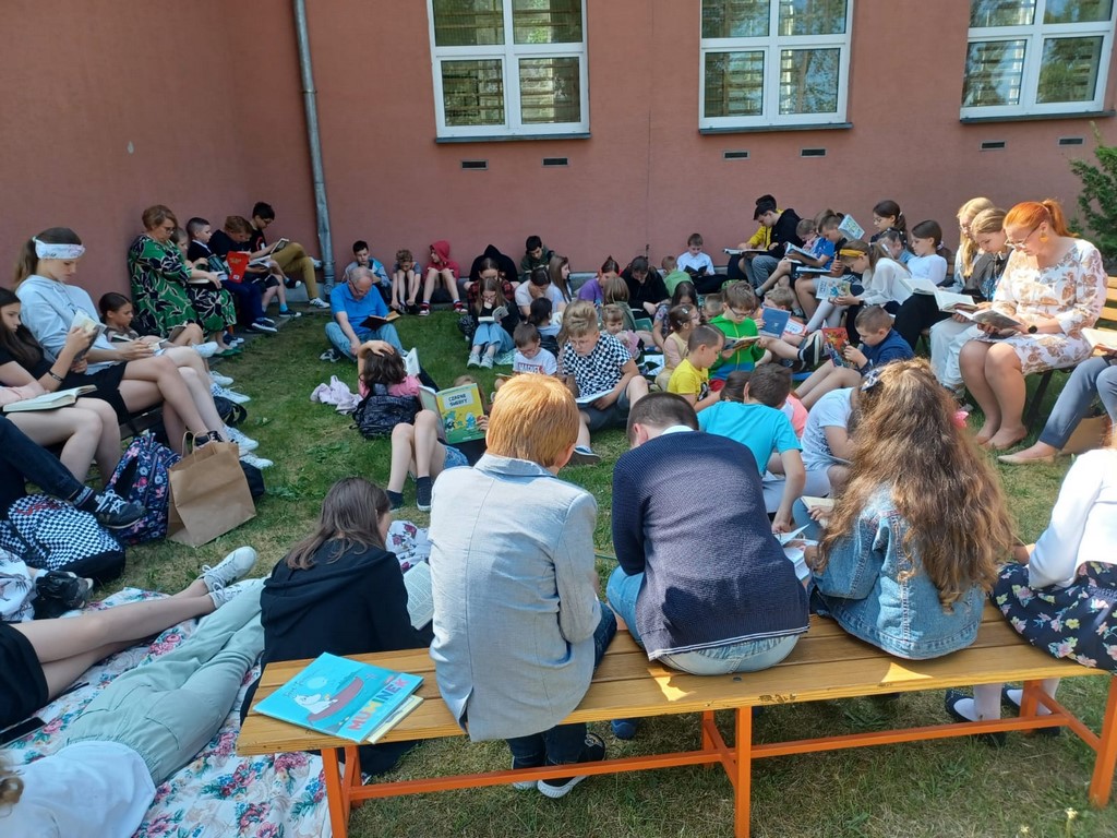 Na miejsce akcji wybraliśmy teren zielony za szkołą, gdzie o godzinie 10.00 w gronie koleżanek, kolegów i nauczycieli w miłych, niecodziennych okolicznościach rozpoczęliśmy wspólne czytanie. Każdy czytał wybraną przez siebie książkę, taką, na jaką miał ochotę. W sumie było 108 osób (część uczniów w tym czasie brała udział w konkursach pozaszkolnych). Nawet najmłodsza grupa przedszkolna, aktywnie uczestniczyła w akcji.