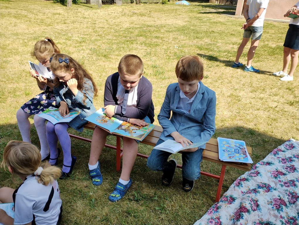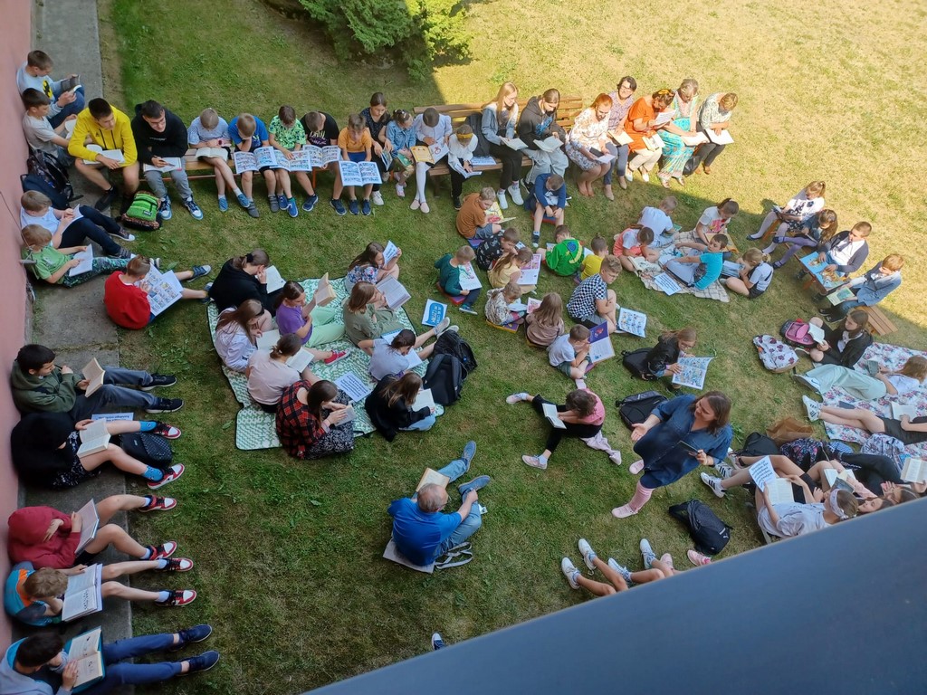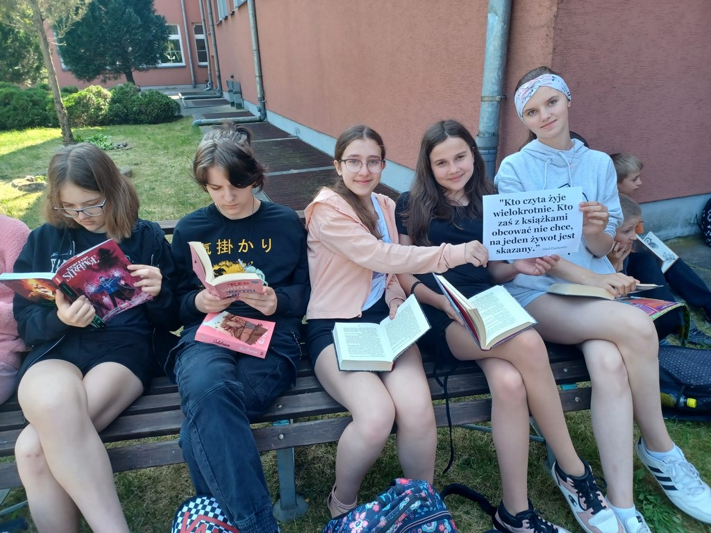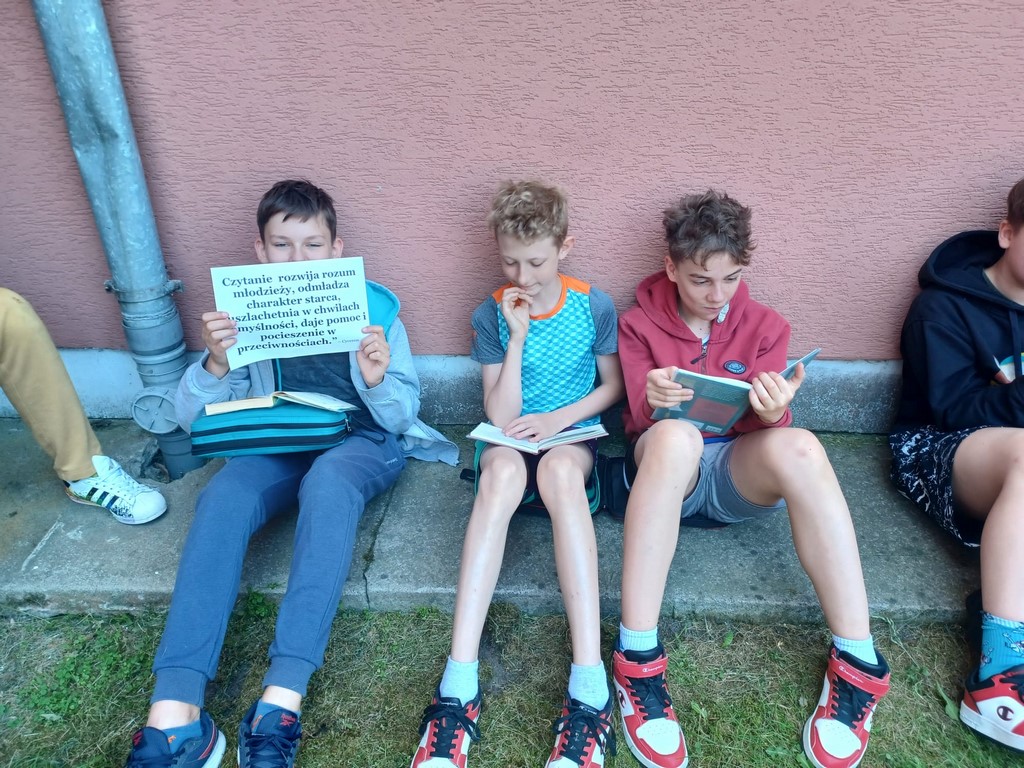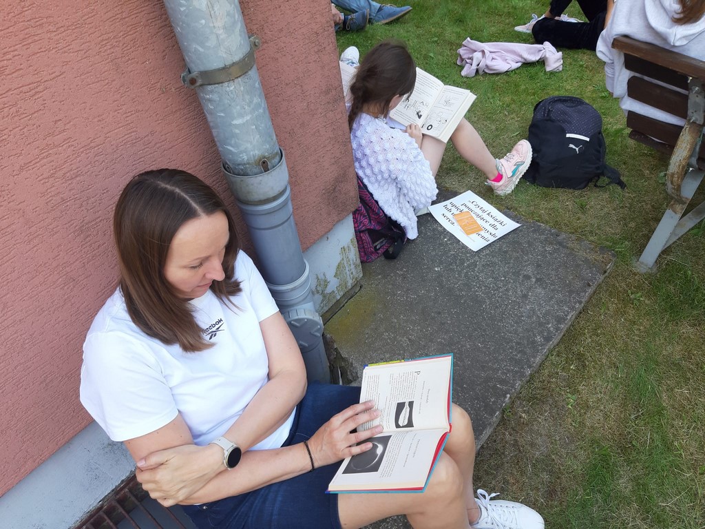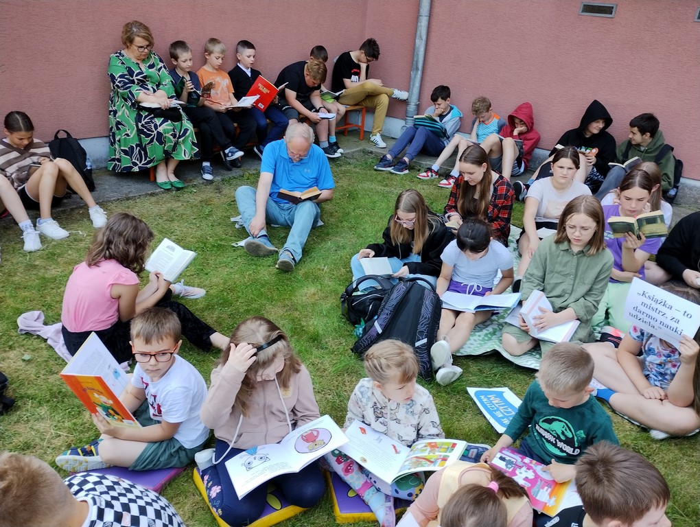 Na miejsce akcji wybraliśmy teren zielony za szkołą, gdzie o godzinie 10.00 w gronie koleżanek, kolegów i nauczycieli w miłych, niecodziennych okolicznościach rozpoczęliśmy wspólne czytanie. Każdy czytał wybraną przez siebie książkę, taką, na jaką miał ochotę. W sumie było 108 osób (część uczniów w tym czasie brała udział w konkursach pozaszkolnych). Nawet najmłodsza grupa przedszkolna, aktywnie uczestniczyła w akcji.