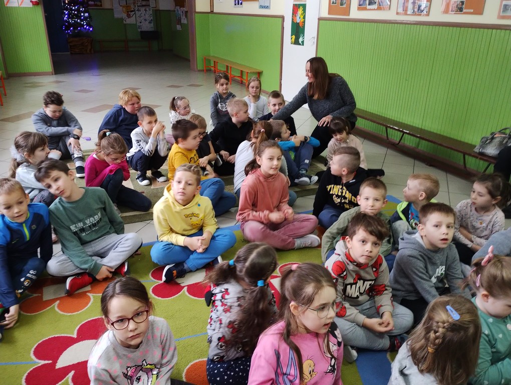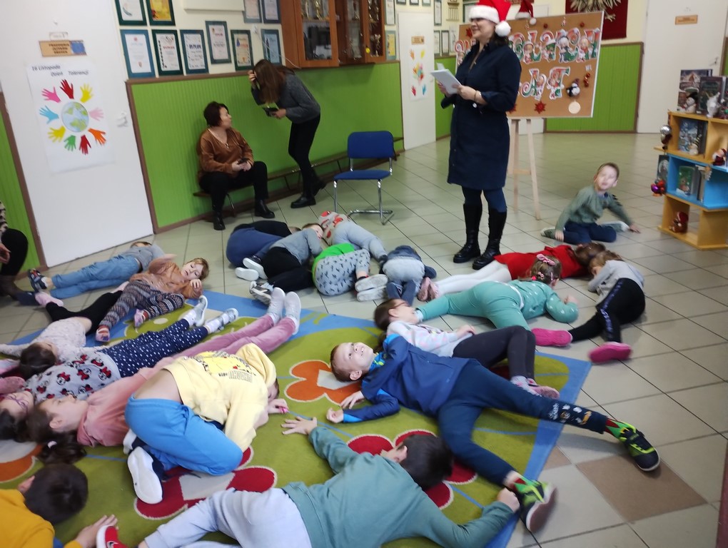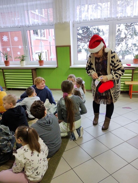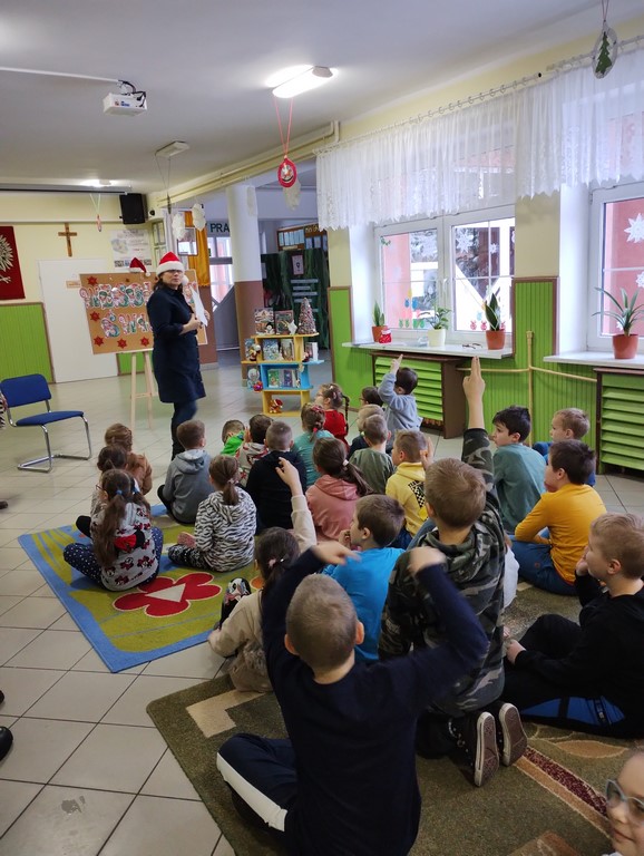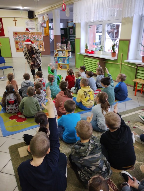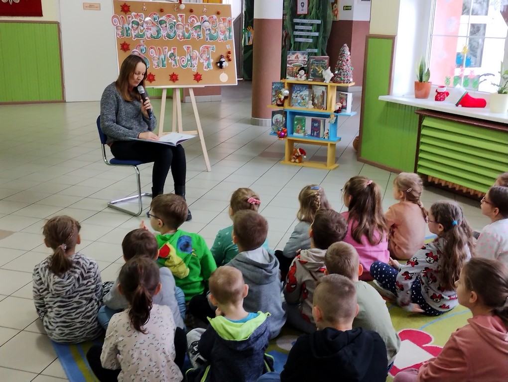 Zbliżające się Święta Bożego Narodzenia były okazją do spotkania się z najmłodszymi czytelnikami. Po krótkiej rozmowie wprowadzającej w tematykę spotkania, dzieci wysłuchały świątecznej opowiastki bożonarodzeniowej, opowiadającej historię małych saneczek, które chciały stać się wielkimi Czerwonymi Saniami Świętego Mikołaja. Dzieci z ciekawością wysłuchały, a potem odpowiadały na pytania dotyczące przeczytanej książki. Były również świąteczne zagadki, quizy i wspólne śpiewanie kolęd. Nie zabrakło oczywiście zabawy ruchowej ( świąteczne karty ruchowe ). Wszystkim udzieliła się świąteczna atmosfera, a całe spotkanie zakończyło się zdjęciem przy choince i przepięknymi świątecznymi piosenkami. Serdecznie dziękuję dzieciom i nauczycielom za udział w spotkaniu.