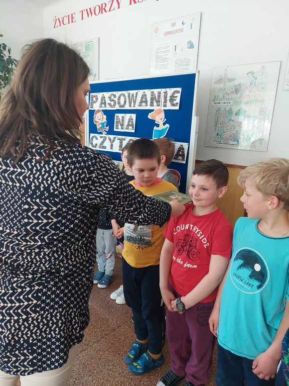 Kolejnym wydarzeniem, odbywającym się z okazji obchodów Tygodnia Bibliotek było PASOWANIE NA CZYTELNIKA BIBLIOTEKI uczniów z klasy pierwszej Szkoły Podstawowej w Białobrzegach. Zanim jednak uczniowie złożyli uroczyste ślubowanie musieli wykazać się znajomością bajek i bajkowych postaci, z czym poradzili sobie doskonale. Następnie zapoznali się z księgozbiorem przeznaczonym dla najmłodszych czytelników, regulaminem biblioteki, sposobem wypożyczania książek oraz prośbami książki. Po takim wprowadzeniu pierwszoklasiści złożyli uroczyste przyrzeczenie - głośno powtarzali słowa przysięgi, w której m.in. przyrzekali, że będą kochać i szanować książki oraz chętnie je czytać, po czym zostali pasowani na czytelników. Na pamiątkę otrzymali dyplom, zakładkę i słodki podarunek.